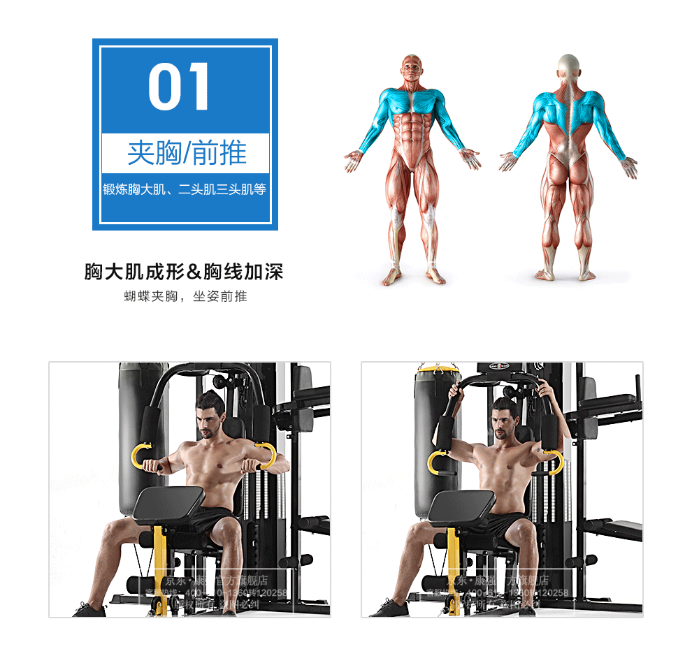功能特點:夾胸/前推,高低位拉桿,綁腿帶訓練,勾腿訓練,雙桿訓練,斜仰臥板,蹬腿訓練,拳擊訓練等